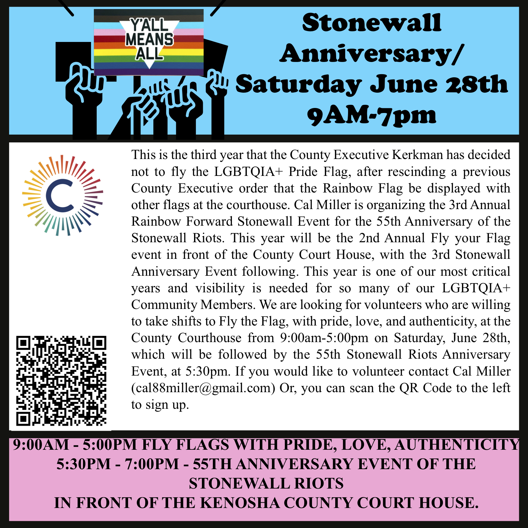 Event background: This is the third year that the County Executive Kerkman has decided not to fly the LGBTQIA+ Pride Flag, after rescinding a previous County Executive order that the Rainbow Flag be displayed with other flags at the courthouse. Cal Miller is organizing the 3rd Annual Rainbow Forward Stonewall Event for the 55th Anniversary of the Stonewall Riots. This year will be the 2nd Annual Fly your Flag event in front of the County Court House, with the 3rd Stonewall Anniversary Event following. This year is one of our most critical years, and visibility is needed for so many of our LGBTQIA+Community Members. We are looking for volunteers who are willing to take shifts to Fly the Flag, with pride, love, and authenticity, at the County Courthouse from 9:00am-5:00pm on Saturday, June 28th, which will be followed by the 55th Stonewall Riots Anniversary Event, at 5:30pm. If you would like to volunteer contact Cal Miller (cal88miller@gmail.com).